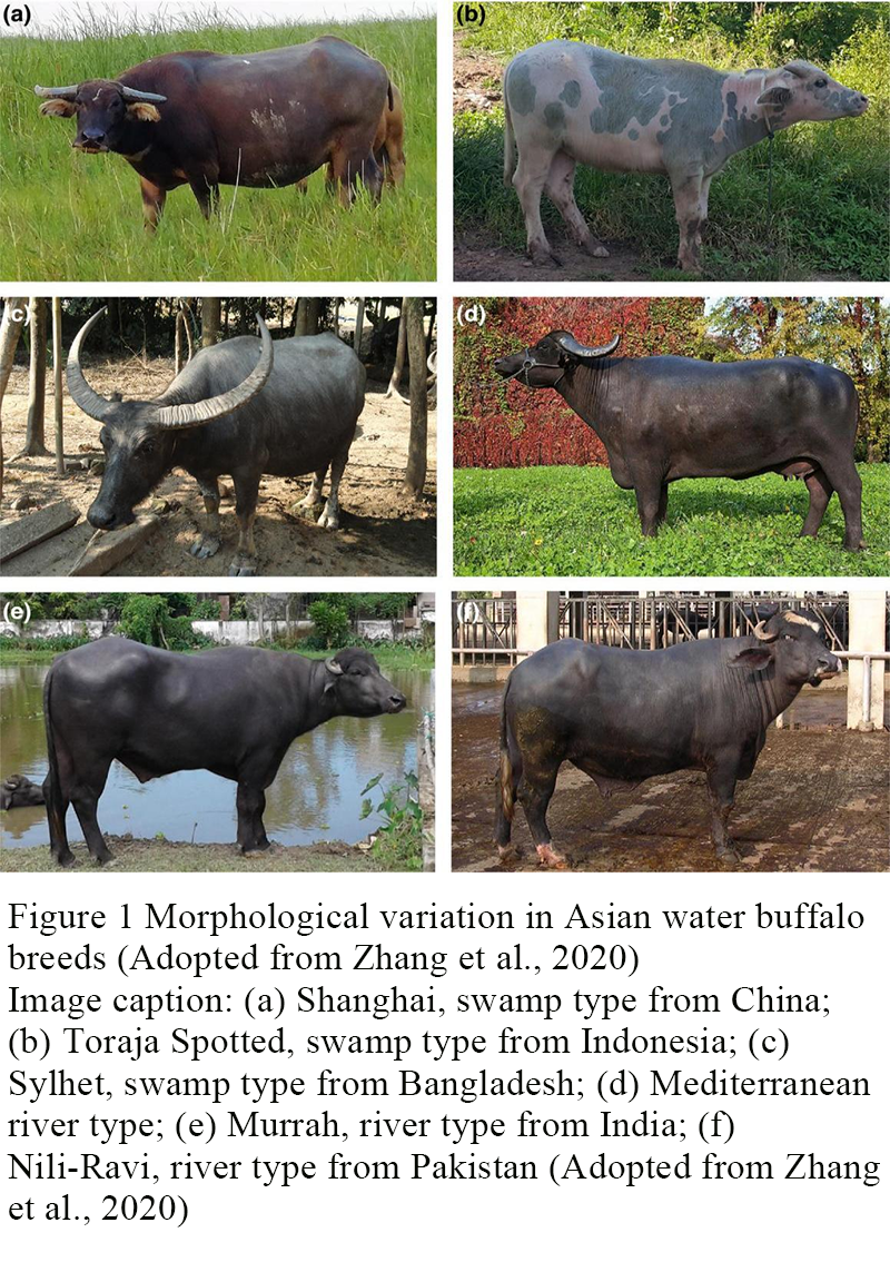 ![]() Figure 1 Morphological variation in Asian water buffalo breeds (Adopted from Zhang et al., 2020) Image caption: (a) Shanghai, swamp type from China; (b) Toraja Spotted, swamp type from Indonesia; (c) Sylhet, swamp type from Bangladesh; (d) Mediterranean river type; (e) Murrah, river type from India; (f) Nili-Ravi, river type from Pakistan (Adopted from Zhang et al., 2020) |