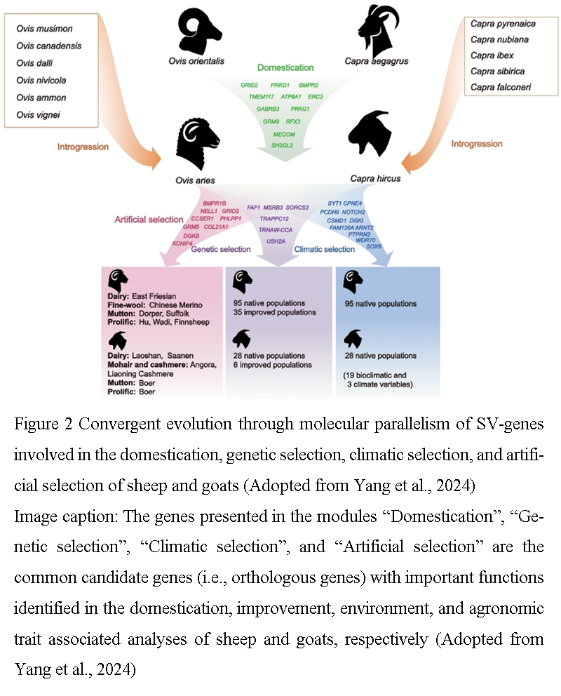 Figure 2 Convergent evolution through molecular parallelism of SV-genes involved in the domestication, genetic selection, climatic selection, and artificial selection of sheep and goats (Adopted from Yang et al., 2024) Image caption: The genes presented in the modules “Domestication”, “Genetic selection”, “Climatic selection”, and “Artificial selection” are the common candidate genes (i.e., orthologous genes) with important functions identified in the domestication, improvement, environment, and agronomic trait associated analyses of sheep and goats, respectively (Adopted from Yang et al., 2024) |
