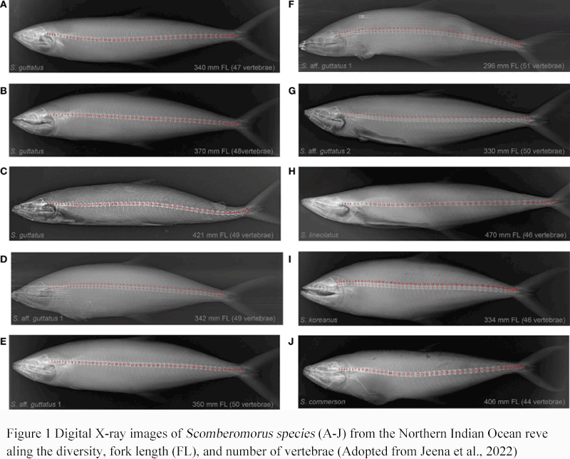 Figure 1 Digital X-ray images of Scomberomorus species (A-J) from the Northern Indian Ocean revealing the diversity, fork length (FL), and number of vertebrae (Adopted from Jeena et al., 2022)