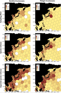 Image caption: Sampling effort (number of distribution records), alpha species richness (number of species per hexagon) and ES50 (expected number of species) of benthic (n = 6939) and pelagic crustaceans (n = 8612) in the NWP is visualized per hexagonal cells (700,000 km2 per cell). Areas without colouring had zero values. Lower counts of coloured grid cells in species richness and expected species richness than in sampling effort are caused by distribution records that lack taxonomic identification to species leve (Adopted from Knauber et al., 2023)